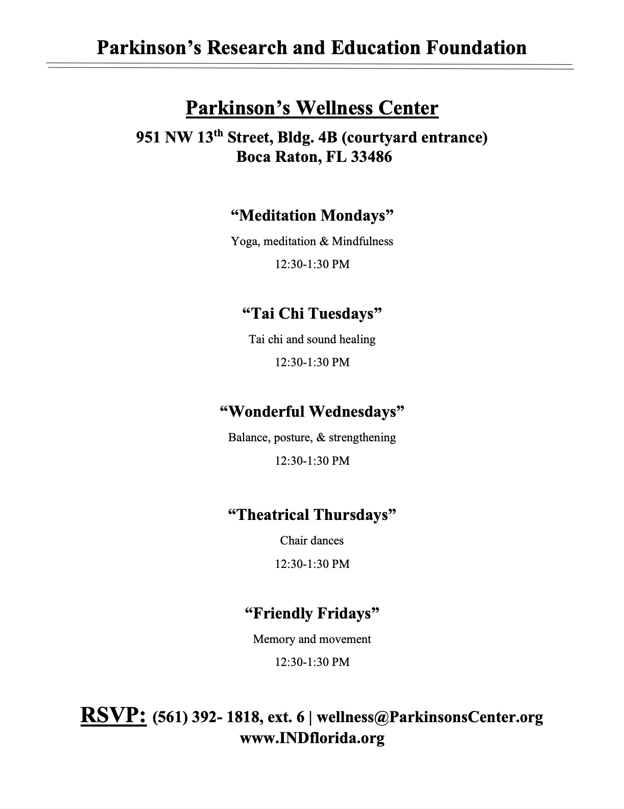 The foundation sponsors wellness classes that provide guided exercises, activities, and techniques that facilitate movement, promote mindfulness, and strengthen memory. Classes are offered every day of the week at the Parkinson's WellnessCenter inBocaRaton,Florida and are open to any member of the local community. Popular classes include healing through Qigong and Tai Chi, drumming and sound healing, and posture, flexibility, and balance courses.